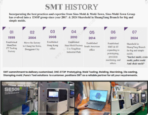 SMT began producing high quality plastic injection molds in 1999, With the increasing demand from our clients, we have expanded into custom processing in fields such as die casting molds, stamping molds, precision components machining, and precision mold spare parts. With its state-of-the-art mold making facility and injection molding processes, SMT has become a reliable partner for offshore customers for verious kind of mold making project.